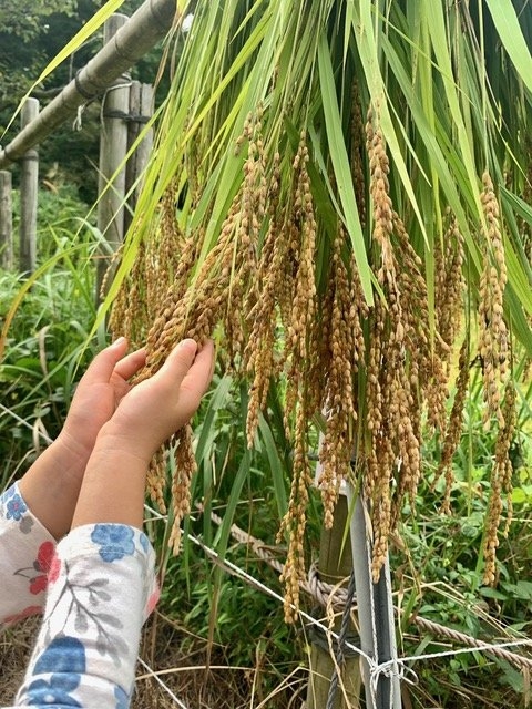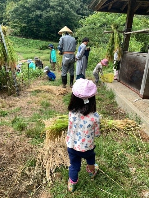 2023年09月25日(月) 森のようちえん 稲刈り 秋晴れの月曜日。 稲刈りをしました。 まずは田んぼを指導してくださっている砂田さんが、お手本を見せてくださいます。 たわわに実った穂先は重みがあります。 さあ稲刈り開始です。 「待ってました!」と、やる気満々で田んぼに入る子、はさがけをお手伝いする子、母さんの背中で稲刈りを体験する子。 ザクっザクっと気持ちのいい音が響きます。 今日はここまで。残りの稲は、木曜の森のみんなで刈ろうね。 田んぼの横でお弁当食べて、駐車場までのんびり帰ります。 (Nちゃん母さん)