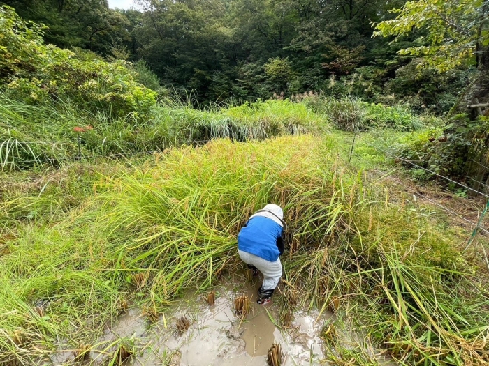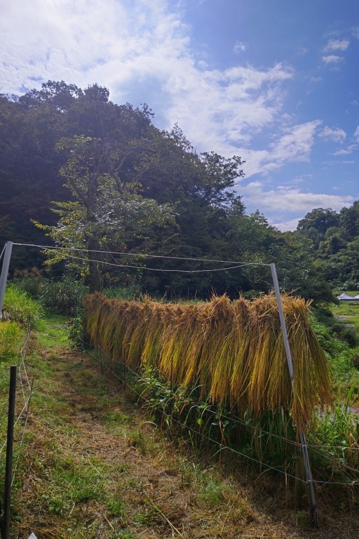 駐車場に着くと、ありがたいことに曇り空。稲刈りをしている時には晴れ間もあり、稲穂についた雨粒がキラキラと輝いていました。
