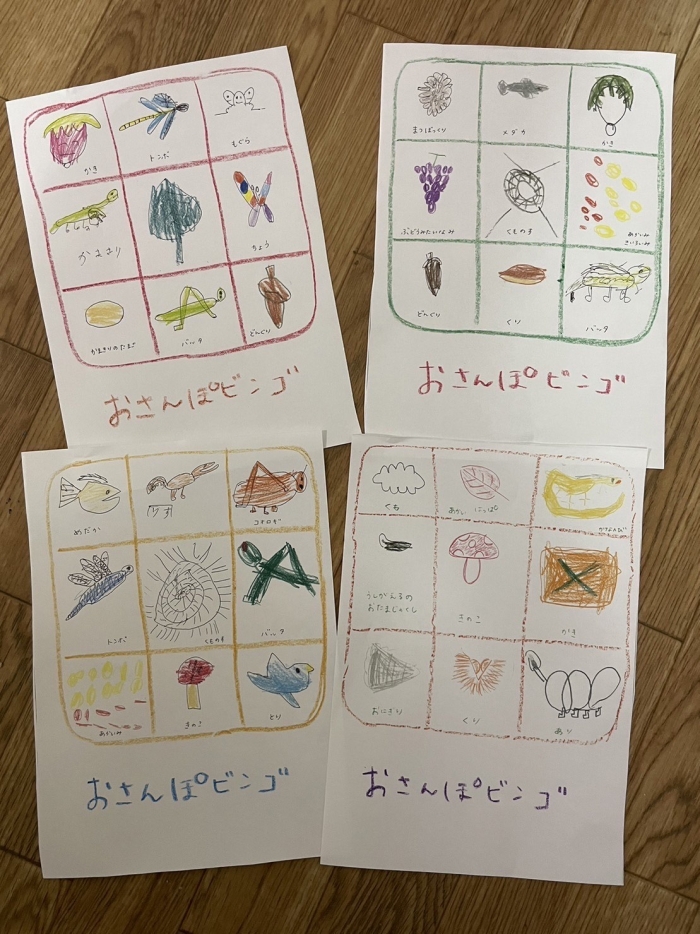 おやつを食べてから、こびとさんが今の季節に合わせて手作りしてくれた、かわいいお散歩ビンゴに紐を通し、お散歩の準備を整えます。