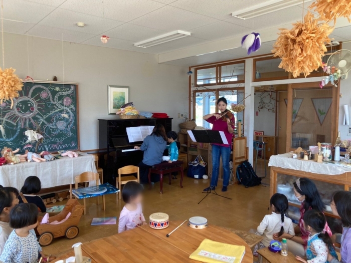 ピアノとヴァイオリンの演奏を聴いて、みんなで「赤鬼と青鬼のタンゴ」という楽しい曲を歌いました。
