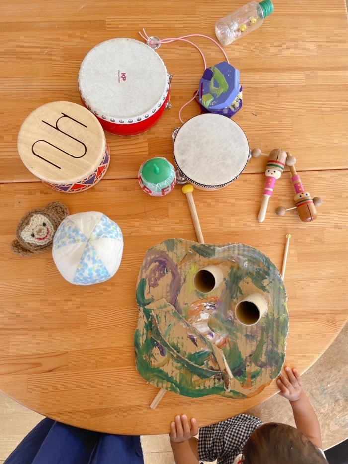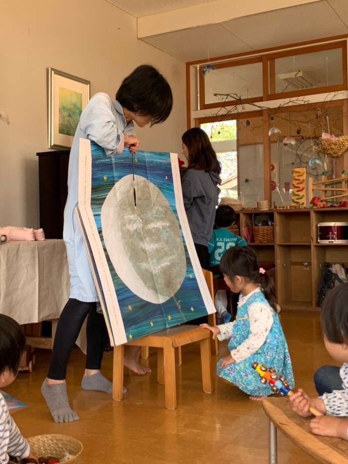それぞれが持ってきた楽器で、曲に合わせてリズムを叩いたり、ピアノの生演奏にのせて、お月さまにまつわる絵本を読んだりもしました。