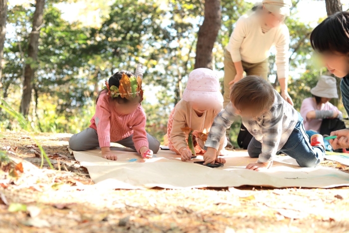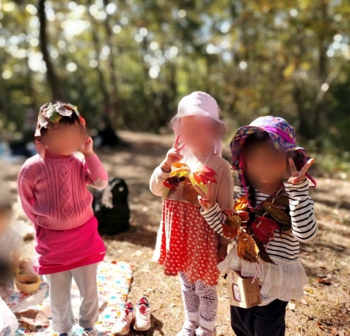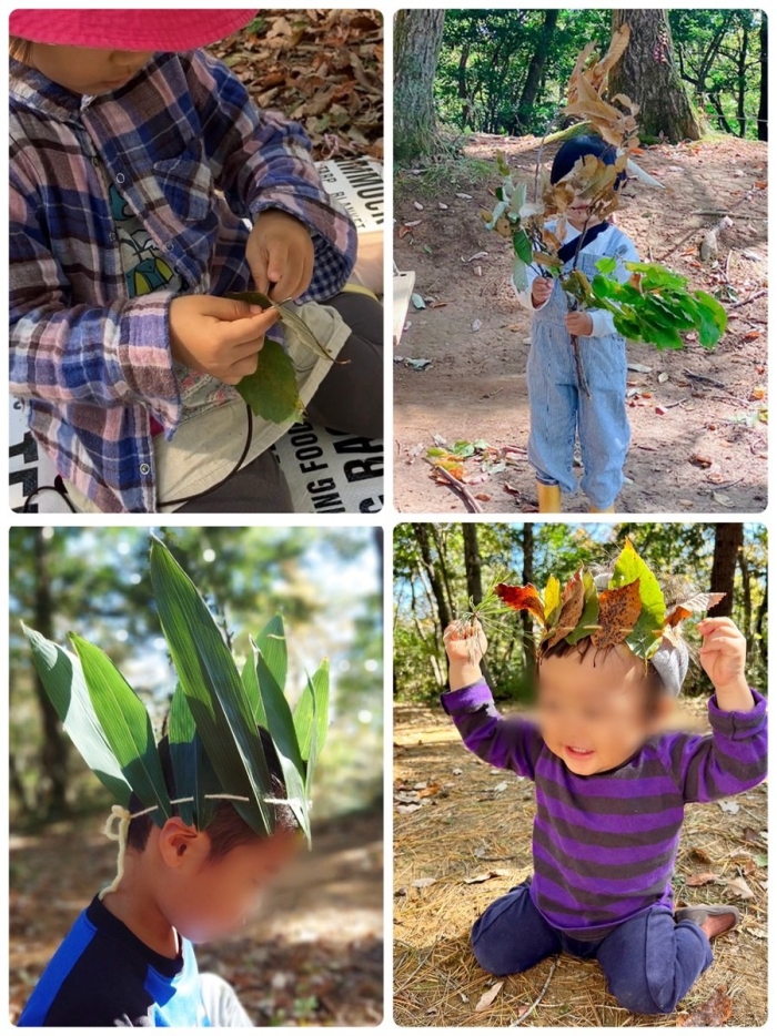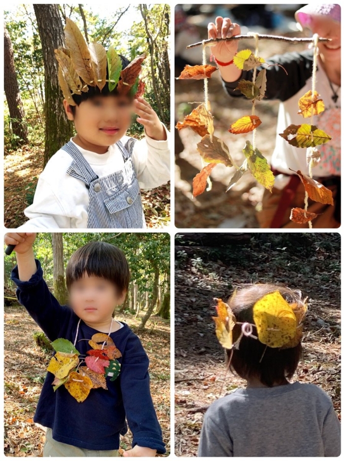 集めた落ち葉を広げ、「どれにしようかな…?」「このいろ、きれいだからこれにする〜!」「ネックレスにしようかな〜?」といろんな声が聞こえてきます。