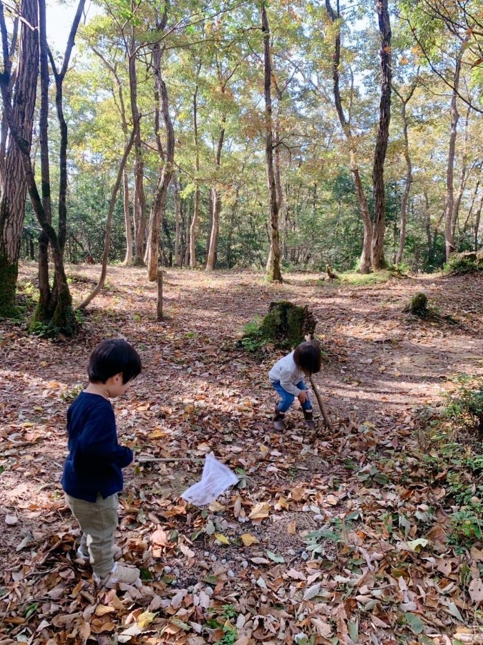 落ち葉の下はどうなっているかな?と枝で落ち葉をかきわけ、「あっ!ドロみえた!」「むしいるよ!」と伝えあったり、「かっこいいぼうがいい!」と枝探しに夢中なこびとさん達。