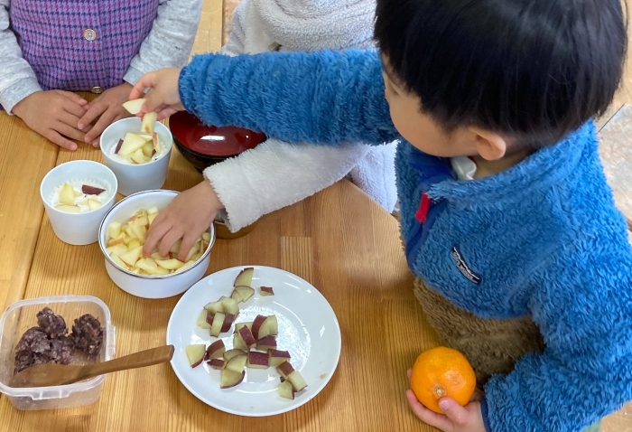 そのあとは、おやつの蒸しパンの生地に、りんごやさつまいもなどの好きなものをトッピングをして。