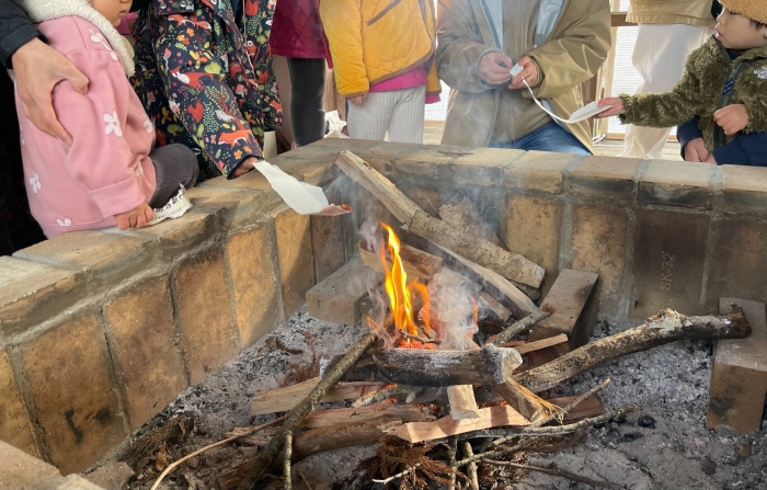 それがまだ出来ない子も、細く切った牛乳パックの先に火をつけてもらい、それを自分で囲炉裏の中にポイと入れる。