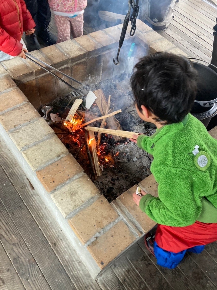 牛乳パックや新聞にマッチで火をつけ、その中に木材を入れて火を大きくしていきます。