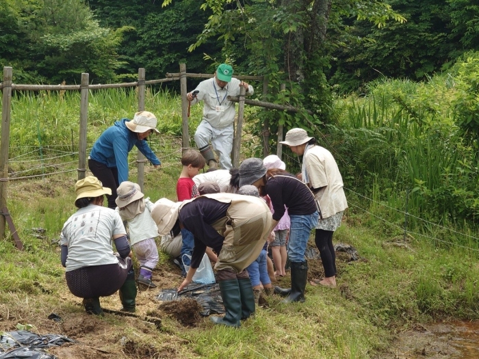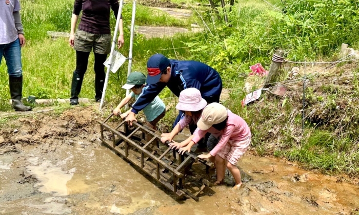 田植えの前に、さつまいもと、枝豆も植えます。あぜ道に豆を植えると、土が栄養いっぱいになるそうです。土手が崩れにくくもなって、良いことづくめ!