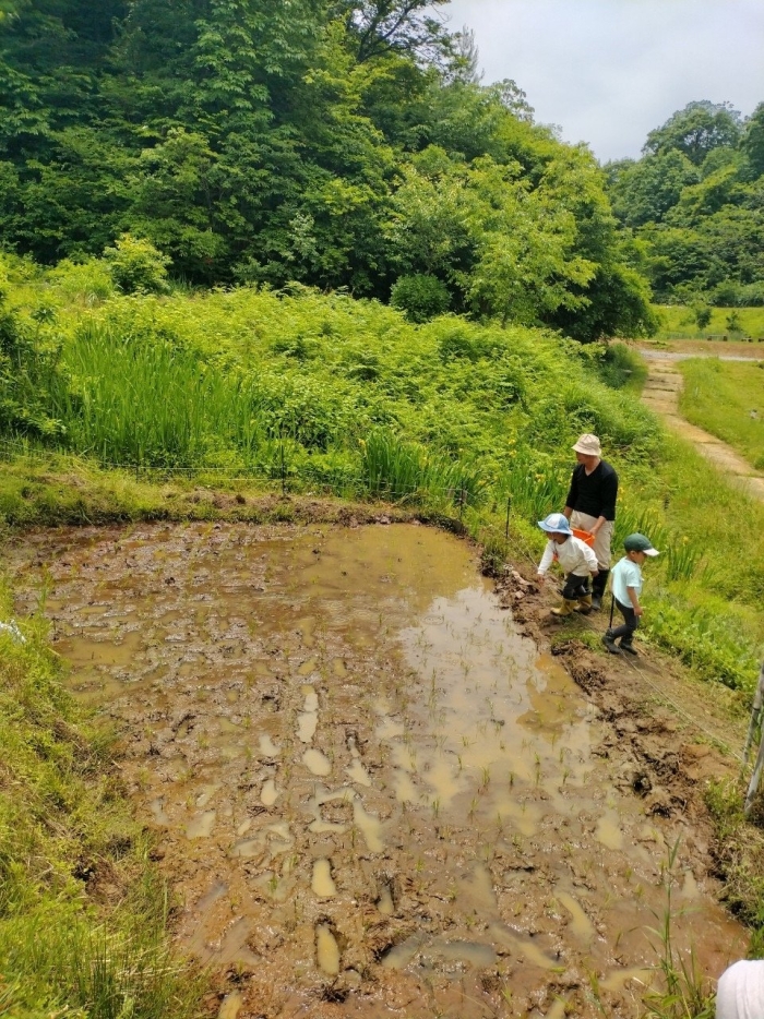 今日は、先週田おこしした森の田んぼに、田植えをしました。