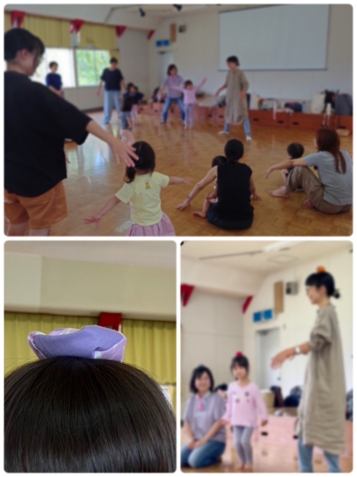 雨粒がポタポタ落ちてきたり、カエルがでてきたり…お手玉で遊んだり。お話を聞きながら身体の動きを通じて表現していると、自然と笑顔が広がる心地良さ。気持ちが通じ合うって楽しいね!