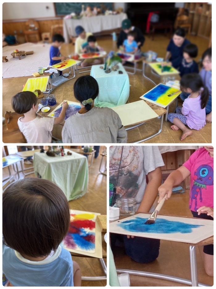 濡れた画用紙の上に筆で色をおくと、ゆっくりゆっくりと変化していく不思議な世界。じーっと変化を見ていたり、すいすい気持ち良さそうに描いたり、じっくりと楽しんでいた子ども達。