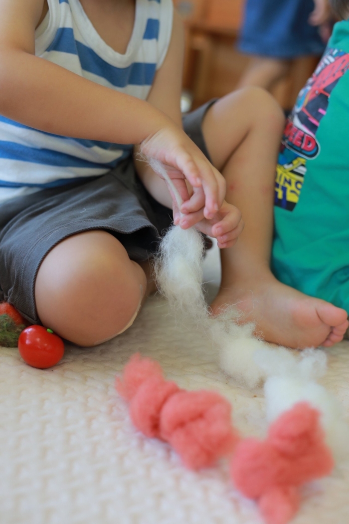 お水でじゃぶじゃぶ羊毛を洗ったよ。小さな手でもみもみもみ。