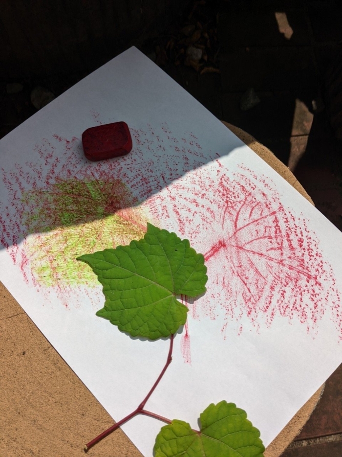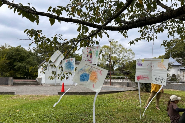 大きな葉っぱ、手の形みたいな葉っぱ、虫さんに食べたれておもしろい形になった葉っぱ…いろんな葉っぱを見つけました。みんな真剣に写し絵。これを使って世界にひとつの凧をつくりました。