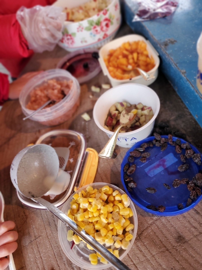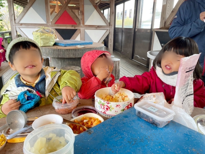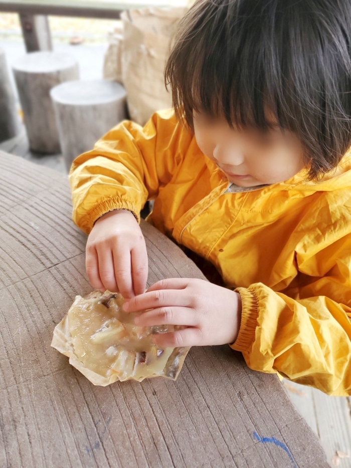 まずは、好きな具材をトッピング!「何にしようかな〜?」「僕レーズンとりんごの2つのせ!」などと考えながら楽しそう。そして、ちょっとお味見のつもりが…パクパク味見するたびにこびとさん達の笑顔が輝いていました。