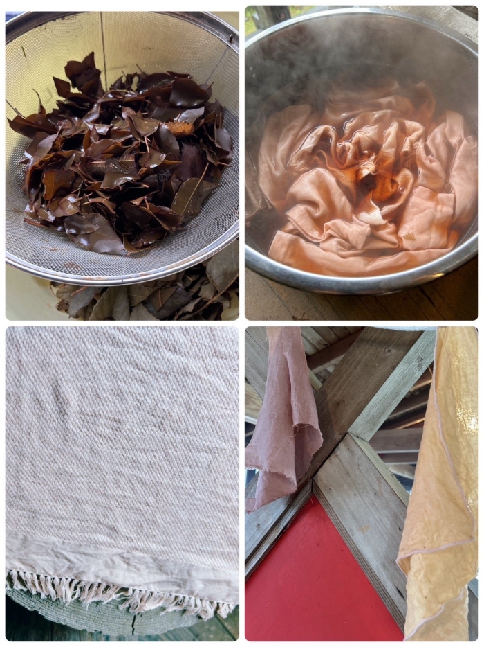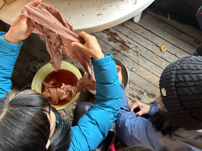 それから豆でっぽうさんに用意して頂いた草木染めに挑戦。自分の持ってきた布を入れて、出来上がりを待ちました。