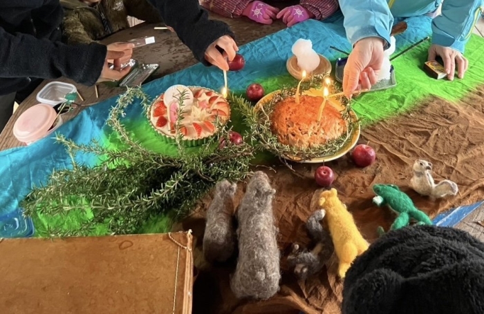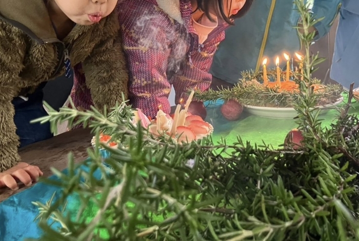 今日は12月のお誕生会。冬は体調を崩しやすい中、主役の二人はとっても元気です。森の動物たちもお祝いにかけつけてくれました。