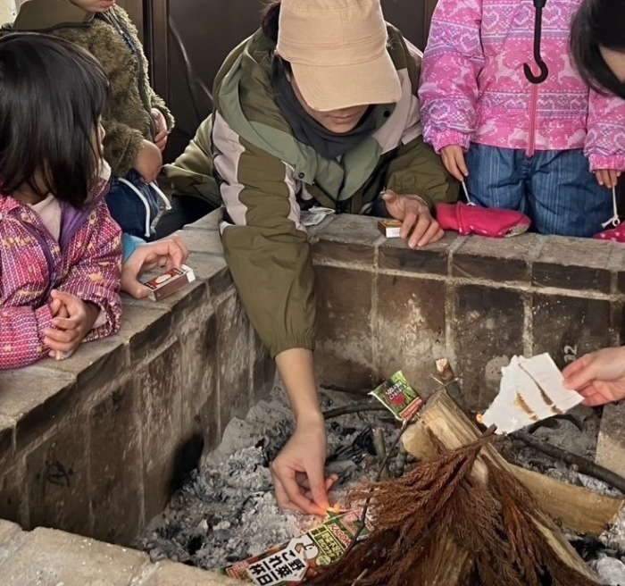 おひさしぶりの囲炉裏です。みんなで火をつけます。