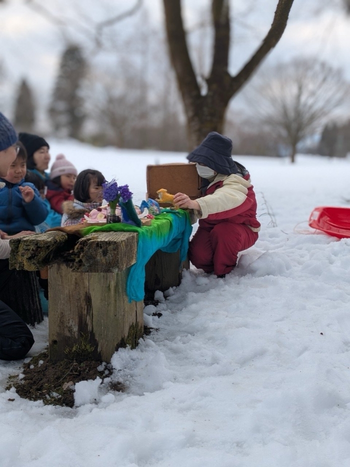 お昼はみんなでポットラックをいただいて、暖かいお味噌汁と飲み物で温まって、もうひと遊び。