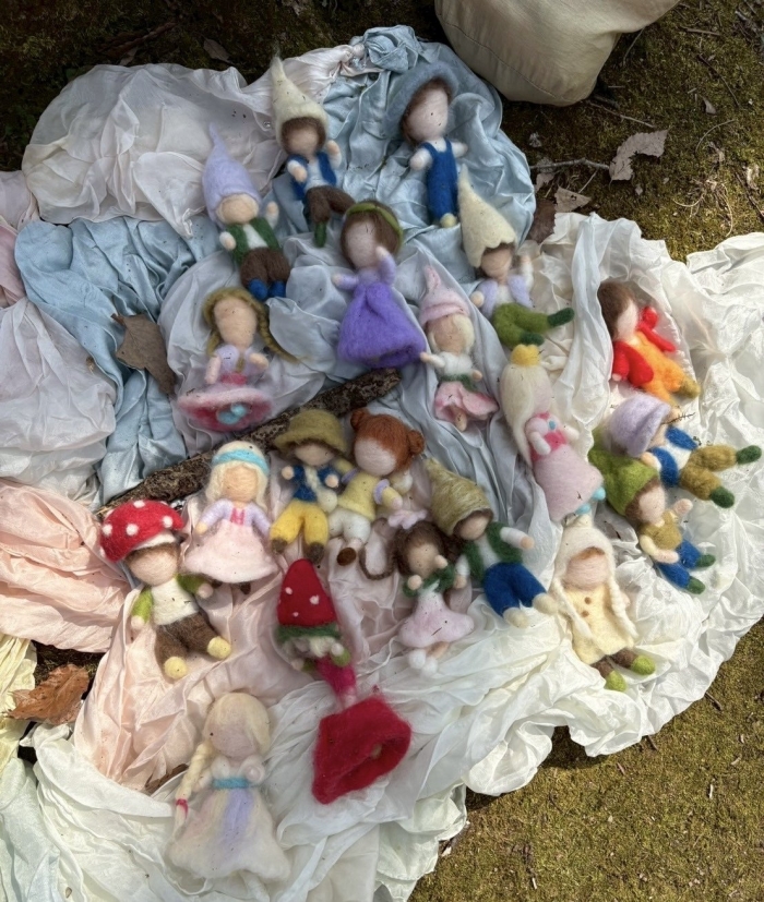 こちらはお誕生日の子に森のお母さんが心をこめて、その子を想いながらつくってくれた羊毛のお人形さんたち。ひとつひとつが違っていて、集まるといっそうかわいくなります。