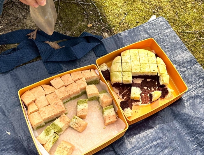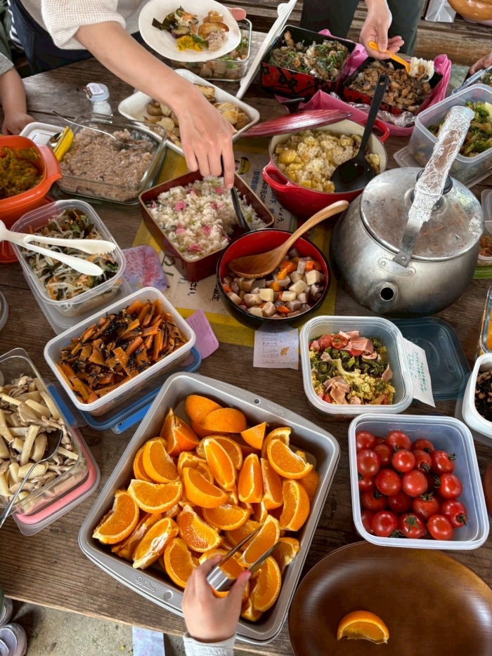 お昼ごはんはお楽しみのお祝いポットラックです。