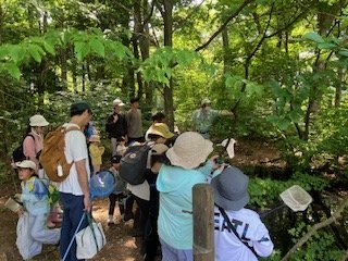 最初に博物館裏の池で、木の枝にあるモリアオガエルの卵を観察しました。