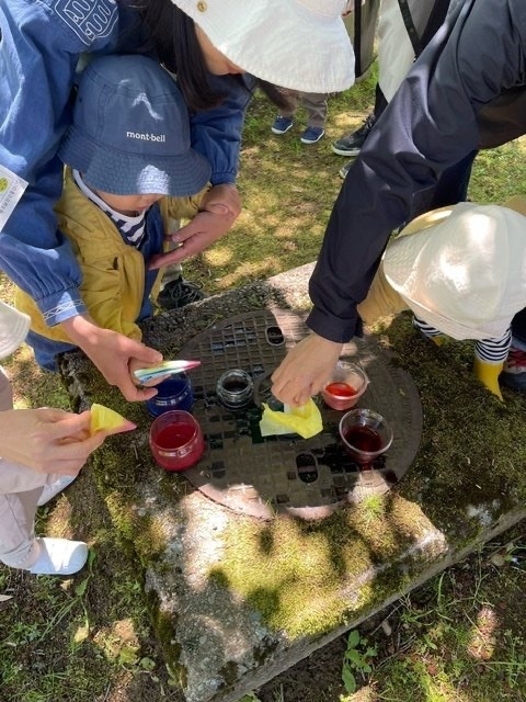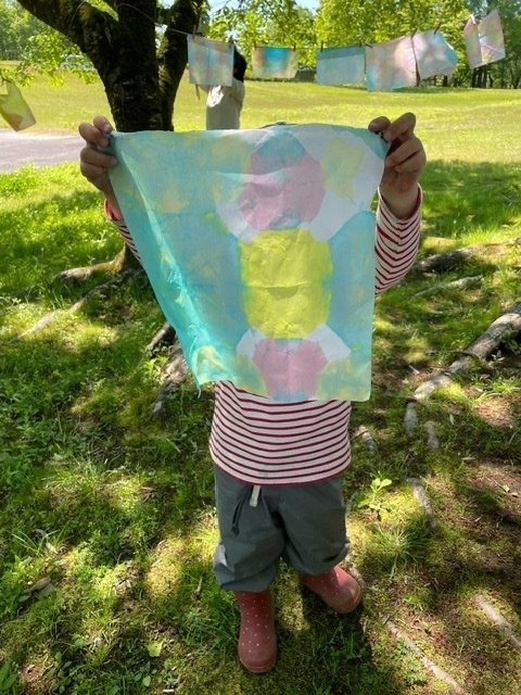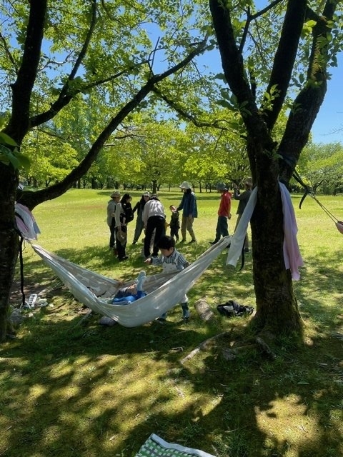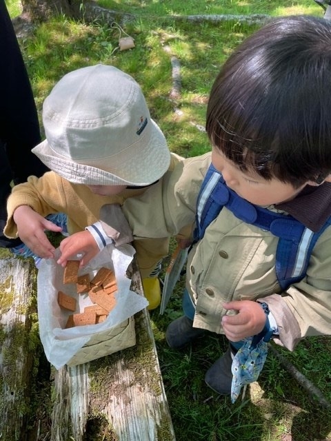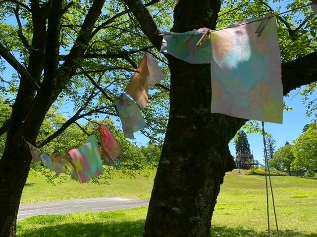 2025年05月08日(木) 折り染めと音楽遊び 澄んだ晴れた日 まずはおやつから この日のおやつはきなこクラッカー 子どもたちのおかわりが止まりません その後は折染 好きな形に折り、好きなところに、好きな色をちょんちょんと浸す さあ、どんな作品ができたかな 何度しても毎度違う素敵な作品 夏には七夕の短冊にも変身します どんな願いごとを書こうかな 今から楽しみだね ご飯の後は音楽遊び 先輩かあさんが楽しい遊びをしてくれました 輪の中で一緒に歌うもよし ハンモックで聞いて楽しむもよし 音楽を身近に感じる時間でした Tくんマミちゃん