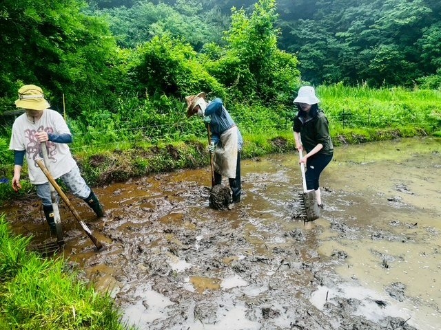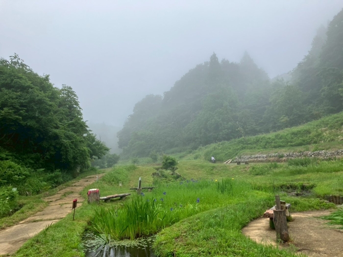 今日は田おこしの日です。1週間前の天気予報では暑い日になりそう、熱中症に気をつけなくてはと思っていました。しかし、当日は霧の中の肌寒い森の日となりました。