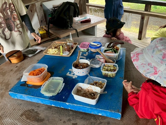 みんなで力仕事をした後は、お楽しみの手巻き寿司ポットラックです。みんなで持ち寄った具をお好みで巻いて食べます。この具とこの具を組み合わせたらどんな味かな?この具とこの具も合うね〜。大人も子どももわくわく、わいわい。美味しくて楽しくてぱくぱく、もりもり食べられちゃいます。ご飯を多めに持ってきたのですが、あっという間に無くなりました〜。