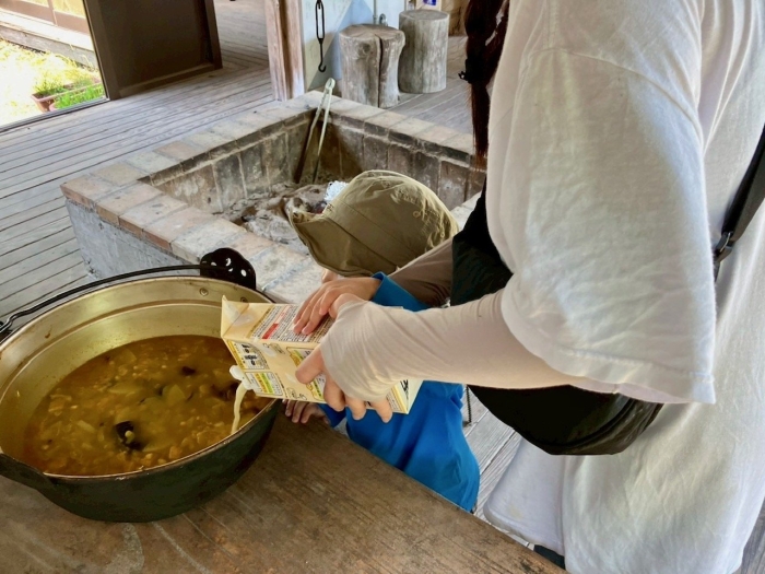 お揚げや鰹粉で和風だよ。仕上げにたっぷりの豆乳を!優しい母さんのカレースープ、たくさん歩いたこびとさんも母さんも、たっぷり味わいました。