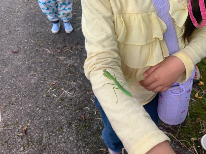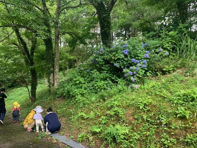 2025年07月17日(木) 高校生とお散歩ビンゴ 7月17日の森。 雨音が体に響き、雨粒が肌にやさしく触れ、心地よい森の中。 今日は高校生のみなさんと一緒に森散歩。「紫陽花が咲いているね」「カマキリいたよ!」「見つけたよ!はっぱの中のびっくりマーク!」様々な森の命に出会い、心動かす子供たち。 自然の中に身をおいて、時間を忘れてゆっくり過ごす、最高のひととき。 森のお友達のみんな、今日も素敵な1日になったね。ありがとう。