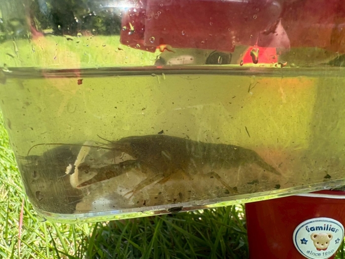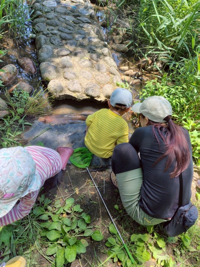 しばらく歩いて桑の実に満足したら、ザリガニ釣りです。